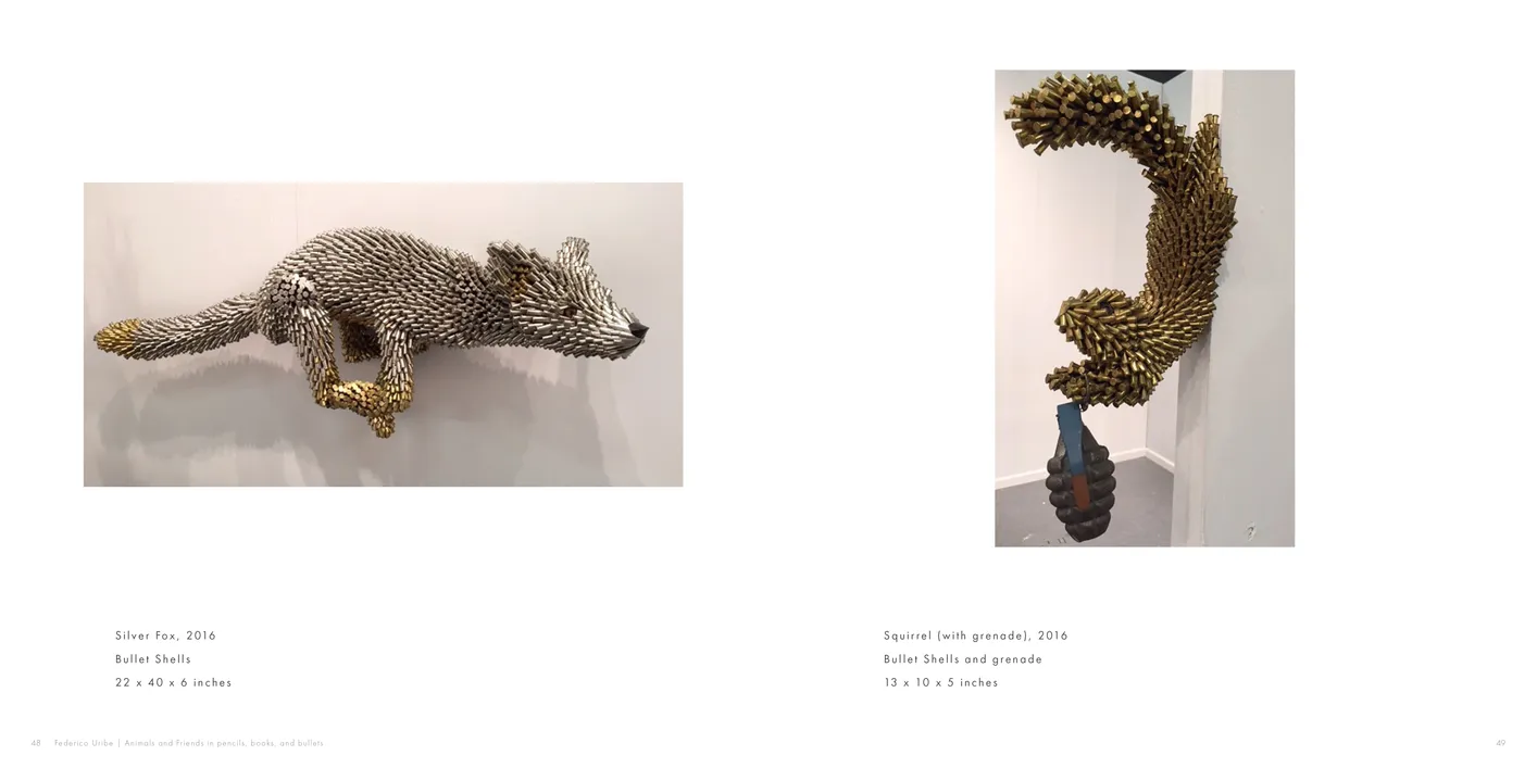 - Federico Uribe: Animals and Friends in Pencils, Books, and Bullets exhibition catalog, pages 48-49