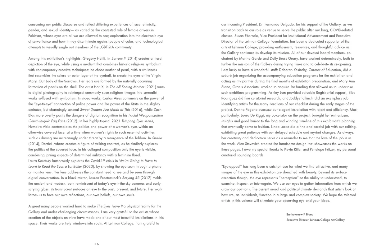 I designed the exhibition catalogue for The Eyes Have It, a themed group exhibition at the Lehman College Art Gallery curated by Bartholomew F. Bland with co-curator Laura J. A. De Riggi. As part of an ongoing collaboration with the gallery’s group exhibitions, these catalogues were intentionally approached with greater visual expressiveness than traditional fine-art publications.